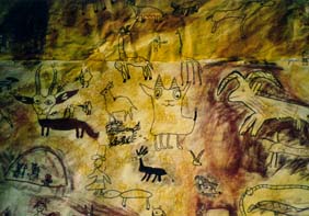 Atelier "Archives des Sables" Après observation des animaux naturalisés, les enfants réalisent une fresque murale à la manière des hommes du Sahara préhistorique |