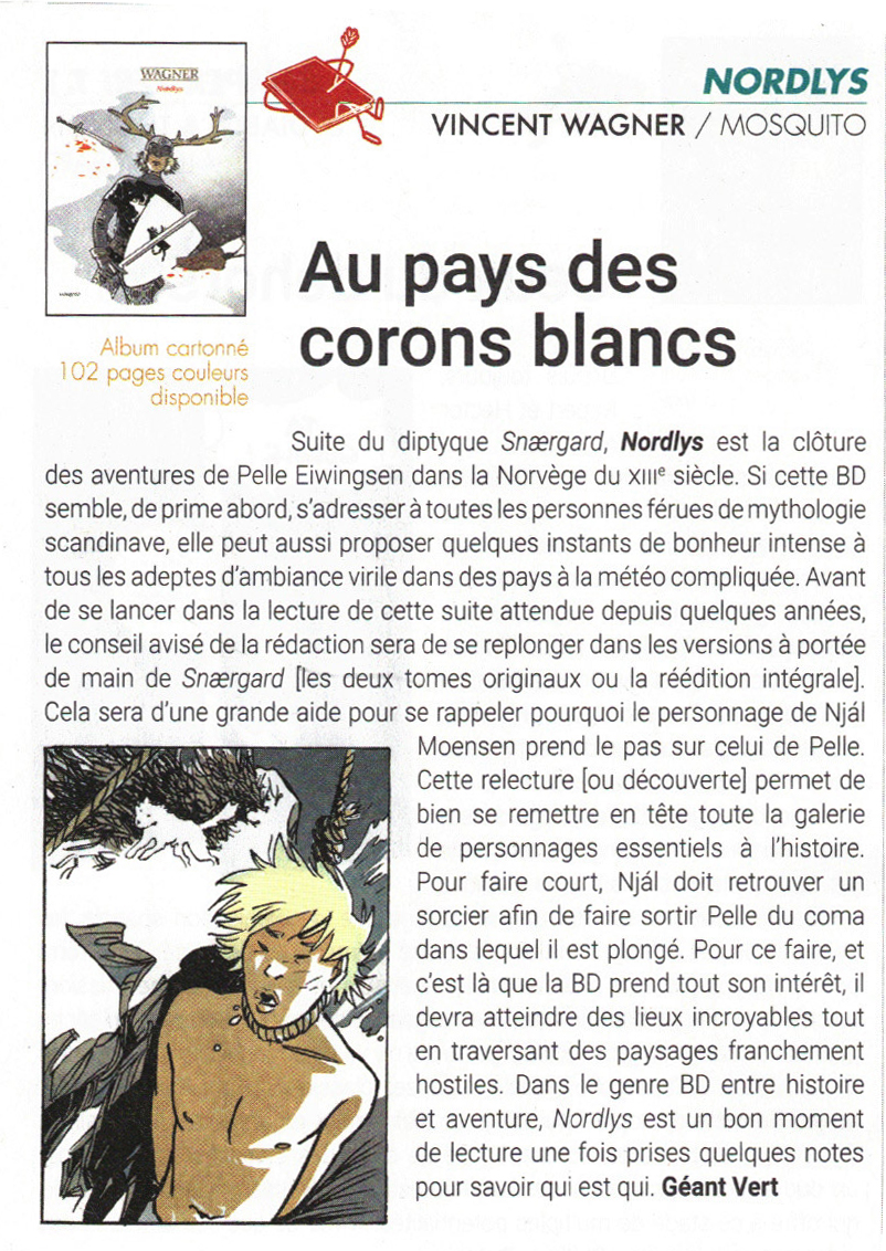 Nordlys avril 2024 Editions Mosquito 102 pages Ado-adultes Norvège, 13ème siècle, Njal Moensen parcourt les fjords à la recherche du sorcier Adriel pour le tuer. Les dieux Ases réclament sa tête pour sortir Pelle Eiwindsen du coma dans lequel il est plongé. Le garçon pense convaincre le père de Pelle de l'aider. Mais le Seigneur des Hauts fjords n'est pas décidé à l'écouter, et le sorcier a plus d'un mauvais tour dans son sac... Les Ases sont-ils aussi loyaux qu'ils le prétendent ? Et que va faire Kjartan, le terrible prince suédois, qui tient enfermés dans sa forteresse Pelle et Solveig, la soeur d'Njal ? Suite et fin de Snaergard, Nordlys clôt la saga de Pelle Eiwindsen dans le bruit et la fureur... Nordlys vu par : - ActuaBD - Bdzoom - Les dossiers de la BD - Lavenir.net - L'Alsace et les DNA - Les Amis de la BD |